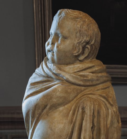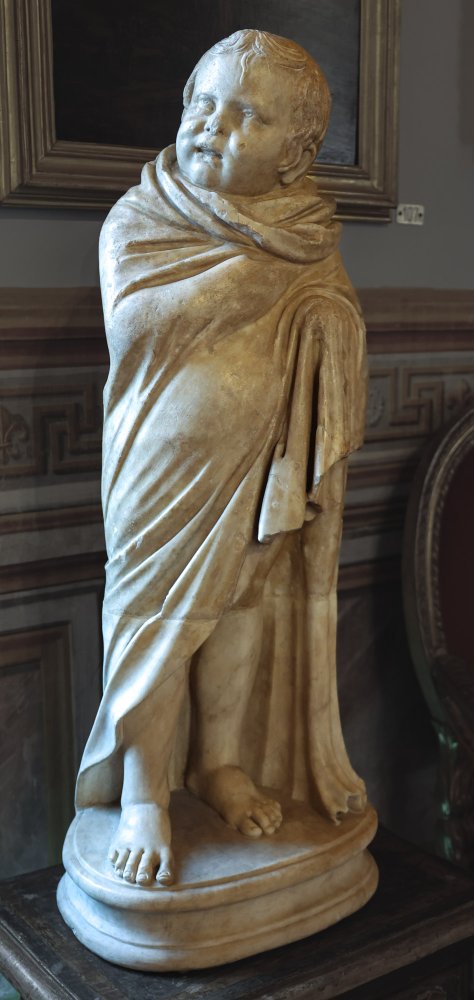 - stehender, in einen Umhang gehüllter Knabe (Kind). Römische Kopie nach frühhellenistischem Vorbild.