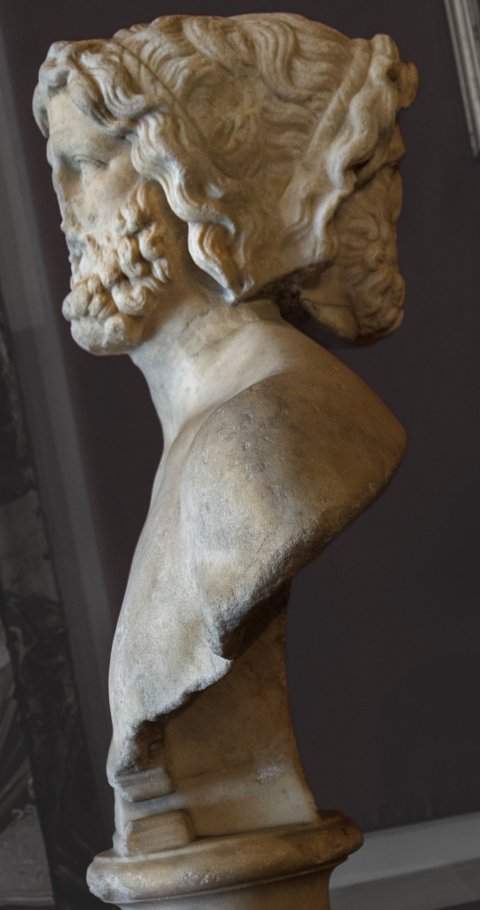 - Mythische Figuren: Doppelherme mit zwei bärtigen Götterköpfen (Janus ?) mit Binde im langen Haar, sekundär auf nackte Oberarmbüste mit Schrifttäfelchen und rundem Fuß gesetzt.