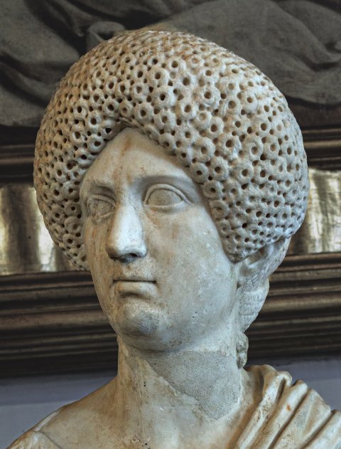 - Porträt einer jungen Frau in geknöpftem Chiton und Mantel, mit flavischer Frisur