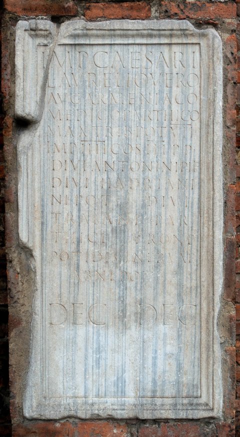 - Imp(eratori) Caesari / L(ucio) Aurelio Vero / Aug(usto) Armeniaco / Medico Parthico / max(imo) trib(unicia) pot(estate) VII / imp(eratori) IIII co(n)s(uli) III p(atri) p(atriae) / divi Antonini Pii f(ilio) / divi Hadriani / nepoti divi / Traiani Par/thici prone/poti divi Nervae / abnepoti / dec(reto) dec(urionum)