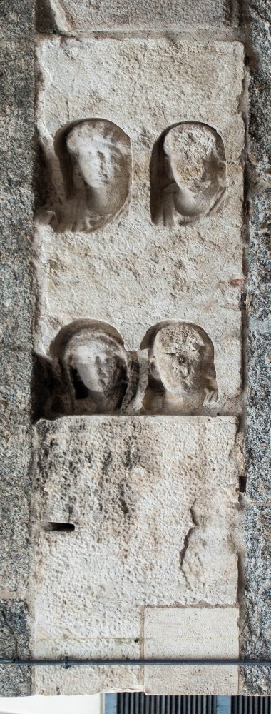 - Stele mit horizontalem Abschluss. Darunter je zwei paarweise übereinander angeordnete Bogennischen mit zwei Ehepaaren. In den linken Nischen je eine Frau, in den rechten je ein Mann.