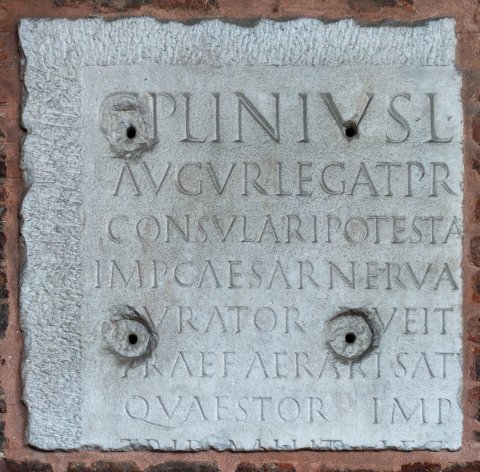 - C(aius) Plinius L(uci) f(ilius) Ouf(entina) Caecilius [Secundus co(n)s(ul)] / augur legat(us) pro pr(aetore) provinciae Pon[ti et Bithyniae pro]/consulari potesta[te] in eam provinciam e[x senatus consulto ab] / Imp(eratore) Caesar(e) Nerva Traiano Aug(usto) German[ico Dacico p(atre) p(atriae) missus] / curator alvei Tiberis et riparum et [cloacarum urbis] / praef(ectus) aerari Saturni praef(ectus) aerari mil[itaris pr(aetor) trib(unus) plebis] / quaestor imp(eratoris) sevir equitum [Romanor(um) turmae ---] / trib(unus) milit(um) leg(ionis) [III] Gallica[e in provincia Syria Xvir stli]/tib(us) iudicand(is) therm[as ---] adiectis in / ornatum HS CCC(trecentis milibus nummum) [--- et eo amp]lius in tutela[m] / HS CC(ducentis milibus nummum) t(estamento) f(ieri) i(ussit) [item in alimenta] libertor(um) suorum homin(um) C / HS CCCCCCCCCCCCCCCCCCMMMMMMMMMMMMCCCCCCXXXXXXVI (decies octies centena milia et sexaginta sex milia cum sescentis sexaginta sex nummum) rei [p(ublicae) legavit quorum inc]rement(a) postea ad epulum / [p]leb(is) urban(ae) voluit pertin[ere --- vivu?]s dedit in aliment(a) pueror(um) / et puellar(um) pleb(is) urban(ae) HS [D(quinquaginta milia) --- et] in tutelam bybliothe/cae HS C(centena milia)
