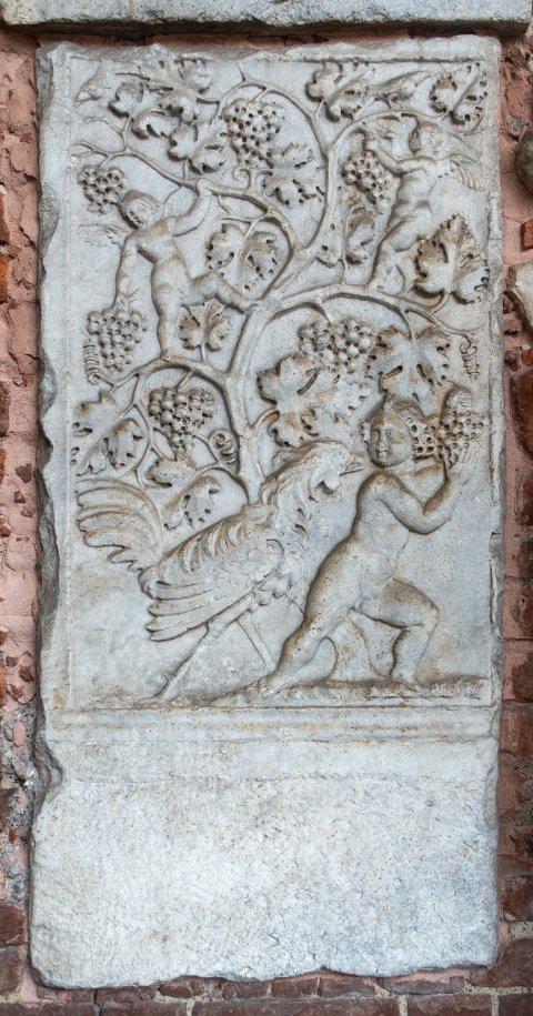 - Aus dem Boden wachsender Weinstock mit reifen Früchten. Darin zwei nackte geflügelte Eroten bei der Ernte, davor Hahn und nackter Erot mit Traube in den Händen, die er vor dem Hahn schützt.