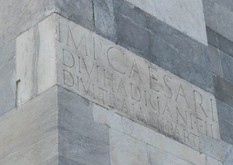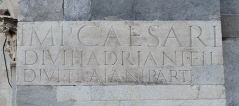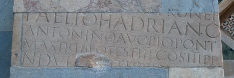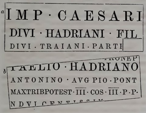 - Imp(eratori) Caesari / divi Hadriani fil(io) / divi Traiani Parth(ici) / [nep(oti) divi Nervae] pronep(oti) / T(ito) Aelio Hadriano / Antonino Aug(usto) Pio pont(ifici) / max(imo) trib(unicia) potest(ate) III co(n)s(uli) III p(atri) p(atriae) / (i)ndulgentissim[o prin]/[cipi]