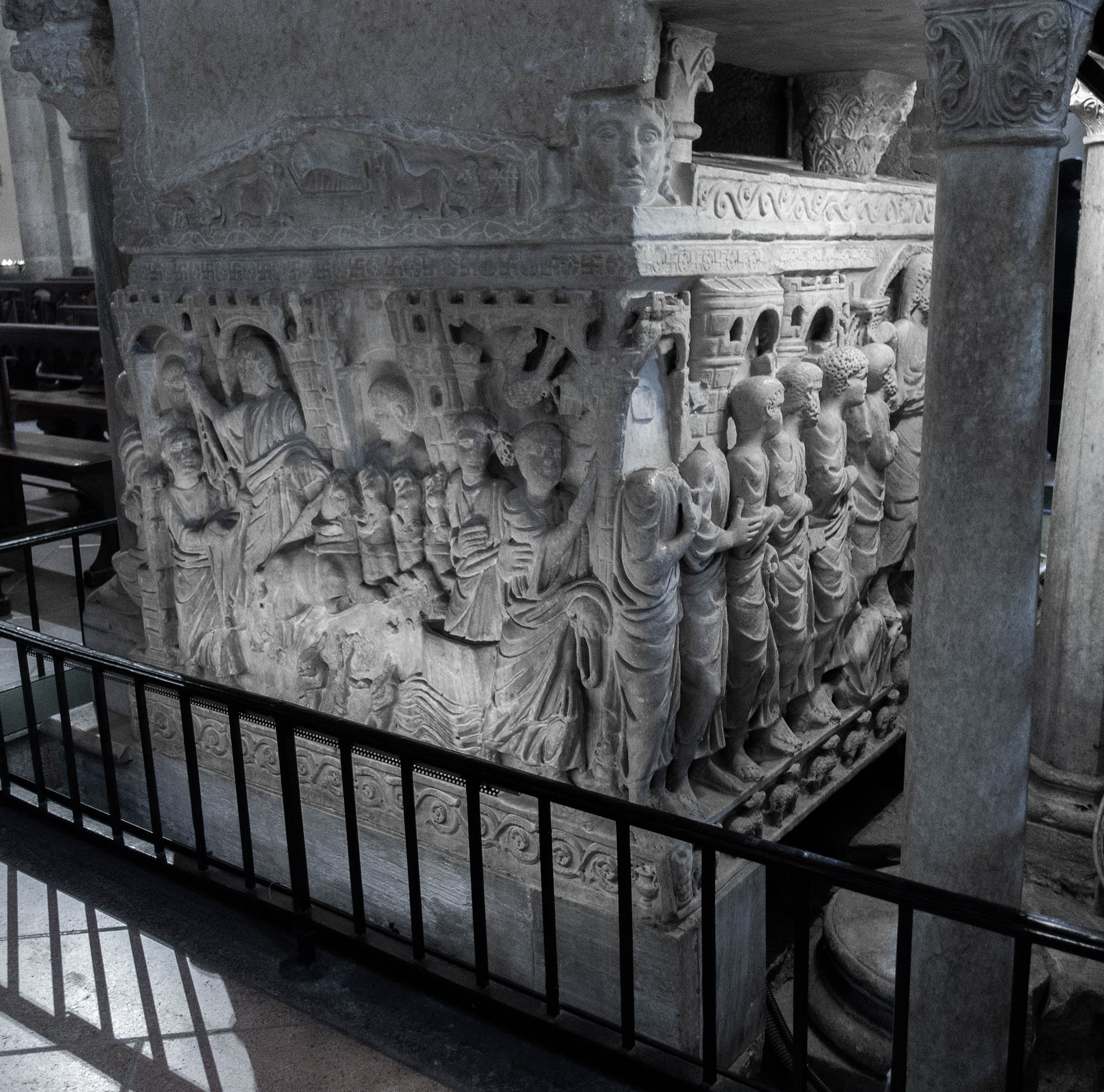 Bilder 1-9 gegen den Uhrzeigersinn um den Sarkophag aufgenommen, 2. Langseite weitgehend verdeckt.