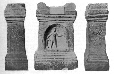 Vorderseite: zentrale rundbogige Nische mit nackter, stehender Figur (lokale Gottheit?), über der Brust bis zu den Oberschenkeln reichendes überkreuztes Band, in der linken Hand einen Becher, in der rechten Ähren (?), links hinter der Figur Altar. Auf der Basis links eine Keule (?), mittig Inschrift, rechts Axt (?).