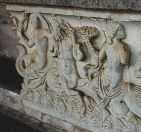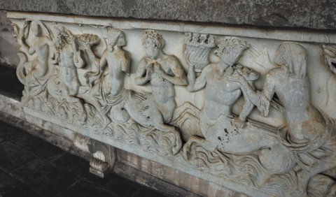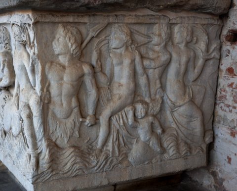 Thiasos mit Meerwesen. Auf der Vorderseite je zwei sich aufeinander zu bewegende Seekentauren mit Nereiden; drei Kentauren spielen ein Musikinstrumt (Lyra, Doppelflöte, Muschelhorn), der vierte trägt einen Korb mit Blumen.