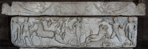 Mythos: auf der Vorderseite Selene und Endymion mit Hund, Eroten, Hypnos, im Hintergrund Bäume, seitlich je ein stehender Trauergenius.