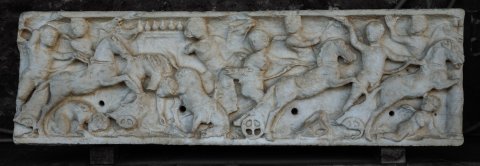 Mythische Figuren. Eroten beim Wagenrennen. Vier Zweigespanne, das zweite von links gestürzt, im Hintergrund vier Reiter, Gestell mit Eiern (Ovaria), am Boden zwei Sand streuende Eroten.