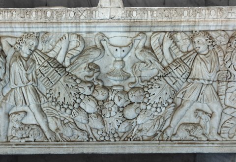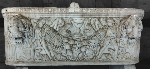 Wannensarkophag. Auf der Vorderseite Girlande, getragen von zwei Eroten in kurzem Chiton, zwischen ihren Beinen liegender Widder und Ziegenbock. Im Girlandenbogen Kelch, aus dem zwei Vögel (Pfau ?) trinken. Unter der Girlande zwei Hähne.