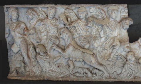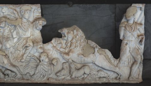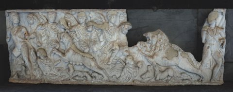 - Löwenjagd, flankiert von den Dioskuren. Im Zentrum Reiter nach rechts, von rechts angreifender Löwe, darunter weitere Tier und gestürzter Mann. Nach links hin Löwin mit Jungen , bekämpft von zwei Reitern, unten gestürzter Jäger.