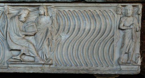 Auf der Vorderseite Riefeln, in der Mitte und an den Ecken Relieffelder. In der Mitte sitzender bärtiger Mann im Mantel mit geöffneter Schriftrolle (volumen) in den Händen. Neben ihm stehende Frau im über den Kopf gezogenem Mantel. In den seitlichen Feldern links Frau in gegürteter Tunica und Mantel, rechts bärtiger Mann im Mantel, Oberkörper unbekleidet. Alle Reliefs mit Draperie im Hintergrund.