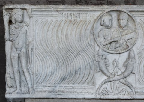 Vorderseite mit Riefeln, in der Mitte Medaillon (Clipeus) mit zwei Porträtbüsten (Ehepaar), Mann in toga contabulata, Frau mit Scheitelzopffrisur. Darunter gekreuzte Füllhörner.