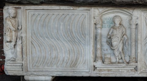 Auf der Vorderseite zwei Felder mit Riefeln, dazwischen Nische mit flachem Bogen auf Säulen mit Spiralkannelur, auf den Enden des Bogens Maskenakrotere; in der Nische auf profiliertem Podest stehender jugendlicher Togatus, neben dem rechten Fuß Rundaltar.