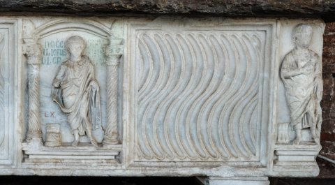 An den Ecken links Mann in kurzer Ärmeltunica und Mantel, vor ihm säulenförmige Basis mit ?; rechts Mann im Mantel, neben ihm Bündel von Schriftrollen (volumen).
