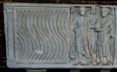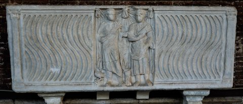 Auf der Vorderseite zwischen den Riefelfeldern rechteckiges Bildfeld mit stehendem Ehepaar vor Draperie. Links Frau mit Scheitelzopffrisur, neben dem rechten Bein Pfau; rechts Mann in toga contabulata, zwischen beiden Bündel von Schriftrollen (volumen).