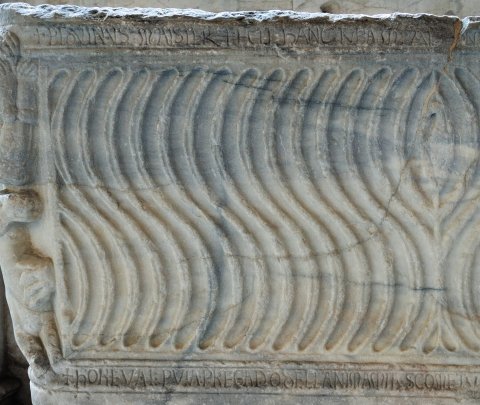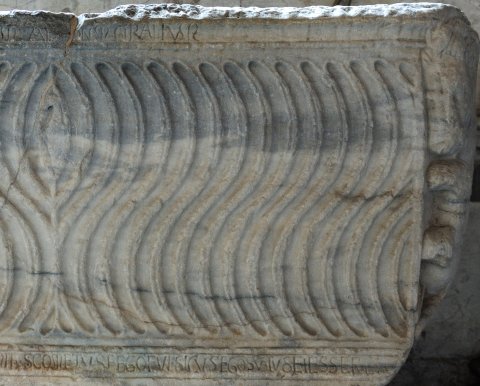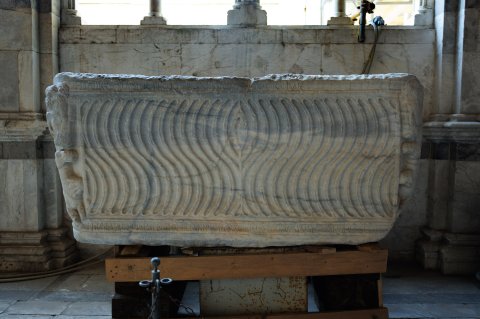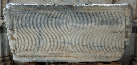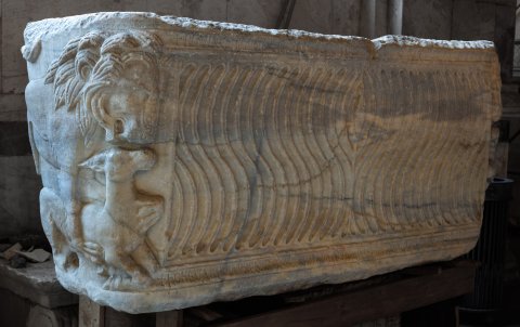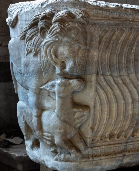 - Wannenförmiger Riefelsarkophag, auf den Schmalseiten große Löwen mit Beutetier (Hirschkuh ?)