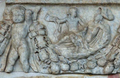 - Mythos ? Fruchtgirlande von zwei Eroten getragen, seitlich schließen weitere Girlanden an; im Girlandenbogen gelagerte Frau und sitzender Mann, beide mit Mantel um Hüften und Beine, Oberkörper entblößt. Mann mit Nackenknoten und Schulterlocken: Dionysos und Ariadne ?