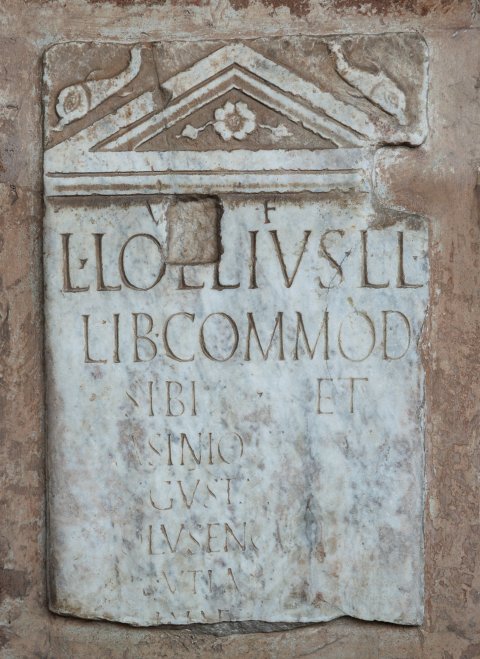 - V(ivus) f(ecit) / L(ucius) Lollius LL(uciorum) lib(ertus) Commod(us) / sibi et / [---] Asinio [---] / Augustali / [--- V]oluseno [---] / [A]ebutiae [---] / [S]abinae / [---]ebiae Am[---] / in ag(ro) p(edes) [---] / [in] f(ronte) p(edes) [---]