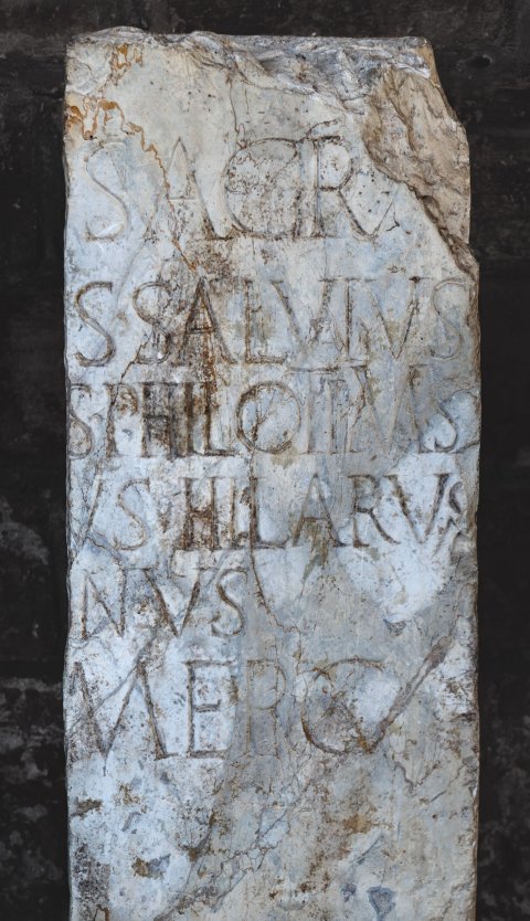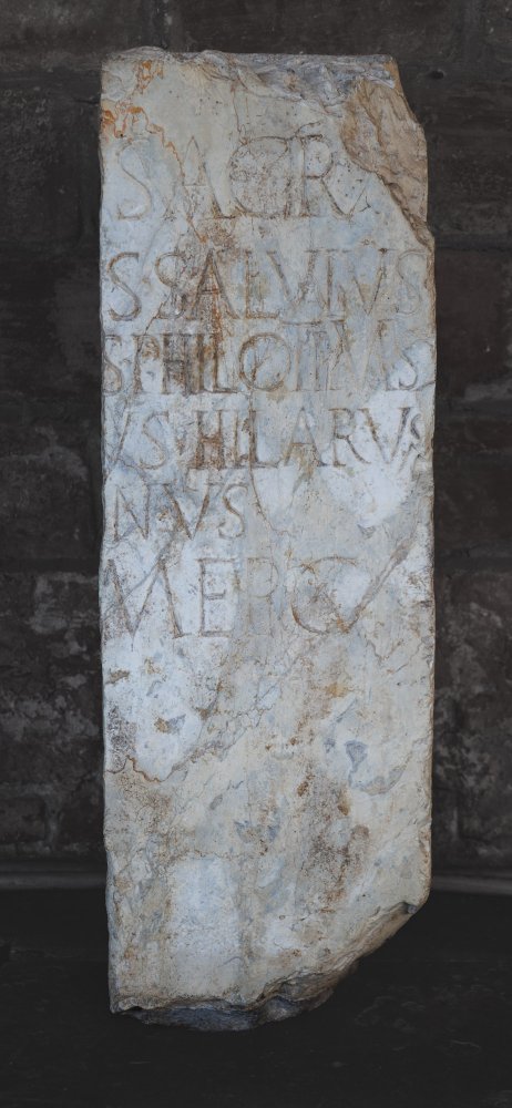 - [---] sacr(um) / [---]s Salvius / [---]s Philotimus / [---]us Hilarus / [---]nus / [---] Merc(uriales)