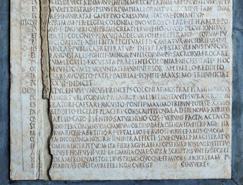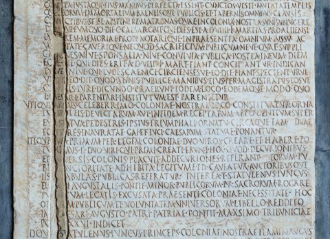 - scrib(endo) ad]/fu[e]r(unt) Q(uintus) Sertorius Q(uinti) f(ilius) Atilius Tacitus P(ublius) Rasinius L(uci) f(ilius) Bassus L(ucius) Lappius / P(ubli) [f(ilius) G]allus Q(uintus) Sertorius Q(uinti) f(ilius) Alpius Pica C(aius) Vettius L(uci) f(ilius) Virgula M(arcus) Herius / M(arci) [f(ilius) P]riscus A(ulus) Albius A(uli) f(ilius) Gutta Ti(berius) Petronius Ti(beri) f(ilius) Pollio L(ucius) Fabius L(uci) f(ilius) Bassus / Sex(tus) [A]ponius Sex(ti) f(ilius) Creticus C(aius) Canius C(ai) <f=E>(ilius) Saturninus L(ucius) Otacilius Q(uinti) f(ilius) Panthera / quod [v(erba) f(acta)] sunt cum in colonia nostra propter contentiones candidato/ru[m m]agistratuus non essent ea acta essent quae infra scripta sunt / cum a(nte) [d(iem) II]II Nonas Apriles allatus esset nuntius C(aium) Caesarem Augusti patris patri/ae [po]ntif(icis) max{s}<i=U>mi custodis imperi(i) Romani totiusque orbis terrarum prae/si[dis f]ilium divi nepotem post consulatum quem ultra finis extremas popu/li [Ro]mani bellum gerens feliciter peregerat bene gesta re publica devicteis aut / in [fid]em receptis bellicosissimis ac max{s}imis gentibus ipsum volneribus pro re / pu[bli]ca exceptis ex eo casu crudelibus fatis ereptum populo Romano iam designa/tu[m i]ustissimum ac simillumum parentis sui virtutibus principem coloniaeque / no[st]rae unicum praesidium eaque res nondum quieto luctu quem ex deces/su [L(uci) C]aesaris fratris eius consulis designati auguris patroni nostri princ[i]/pis [iu]ventutis colonia universa susceperat renovasset multiplicassetque / ma[er]orem omnium singulorum universorumque ob eas res universi decu/rio[ne]s colonique quando eo casu in colonia neque IIvir(i) neque praefecti / er[an]t neque quisquam iure dicundo prae(e)rat inter sese consenserunt pro / ma[g]nitudine tantae ac tam improvisae calamitatis oportere ex ea die / qu[a ei]us deces(s)us nuntiatus esset usqu<e=I> ad eam diem qua ossa relata atque / co[nd]ita iustaque eius Manibus perfecta essent cunctos veste mutata templis/qu[e d]eorum immortalium balneisque publicis et tabernis omnibus clausis / co[nv]ictibus sese apstinere matronas quae in colonia nostra sunt sublugere / di[em]que eum quo die C(aius) Caesar obi(i)t qui dies est a(nte) d(iem) VIIII K(alendas) Martias pro Alliensi / lu[gub]rem memoriae prodi notarique in praesentia omnium iussu ac / vo[lun]tate caverique ne quod sacrificium publicum neve quae suppli/ca[tio]nes nive sponsalia nive convivia publica postea in eum diem / eo[ve d]ie qui dies erit a(nte) d(iem) VIIII K(alendas) Mart(ias) fiant concipiantur indican/tu[rve] nive qui ludi scaenici circiensesve eo die fiant spectenturve / ut[ique] eo die quodannis publice Manibus eius per magistratus eosve / qu[i Pi]sis iure dicundo prae(e)runt eodem loco eodemque modo quo / L(ucio) C[aes]ari parentari institutum est parentetur / utique [ian]us celeberrimo coloniae nostrae loco constituatur orna/tu[s sp]oleis devictarum aut in fidem receptarum ab eo gentium super / eu[m st]atua pedestris ipsius triumphali ornatu circaque eam duae / eq[uest]res inauratae Gai et Luci Caesarum statuae ponantur / utique [cu]m primum per legem coloniae duoviros creare et habere po/tu[eri]mus ii duoviri qui primi creati erunt hoc quod decurionibus / et [uni]versis colonis placuit ad decuriones referant eorum pu/bl[ica] auctoritate adhibita legitume id caveatur auctoribusque / iis [in t]abulas publicas referatur interea T(itus) Statulenus Iuncus / fla[me]n Augustalis pontif(ex) minor publicorum p(opuli) R(omani) sacrorum rogare/tu[r uti] cum legatis excusata praesenti coloniae necessitate hoc / of[ficiu]m publicum et voluntatem universorum libello reddito / Im[p(eratori) Ca]esari Augusto patri patriae pontif(ici) max{s}imo tribuniciae / po[test(atis)] XXVI indicet / idqu[e T(itus) St]atulenus Iuncus princeps coloniae nostrae flamen August(alis) / po[ntif(ex)] minor publicorum p(opuli) R(omani) sacrorum libello ita uti supra scriptum / es[t Imp]eratori Caesari Augusto pontif(ici) maximo tribun(iciae) potest(atis) XXVI pat(ri) / pat[riae] reddito fecerit placere conscriptis quae a(nte) d(iem) IIII Nonas Apriles / qu[ae Sex(to)] Aelio Cato C(aio) Sentio Saturnino co(n)s(ulibus) fuerunt facta acta con/st[ituta] sunt per consensum omnium ordinum ea omnia ita fieri agi ha/be[ri] obse]rvarique ab L(ucio) Titio A(uli) f(ilio) et T(ito) Allio T(iti) f(ilio) Rufo IIviris et ab eis quicum/qu[e post]ea in colonia nostra IIvir(i) praefecti sive qui ali(i) magistratus / er[unt] omnia in perpetuom(!) ita fieri agi haberi o<b=P>servarique utiq(ue) L(ucius) Titius / A(uli) [f(ilius) T(itus) A]llius T(iti) f(ilius) Rufus IIviri ea omnia quae supra scripta sunt ex decret(o) / nos[tro] coram pro quaestoribus primo quoque tempore per scribam pu/bl[i]c[um i]n tabulas publicas referenda curent / censuere