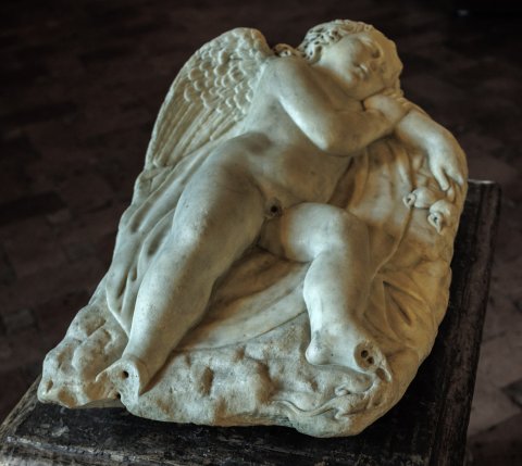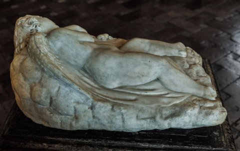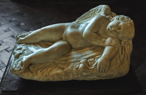 - Mythische Figur: schlafender Amot (Erot, Hypnos ?), liegt auf dem über Felsen gebreiteten Mantel, in der linken Hand Mohnstängel; am Fußende der Plinthe Eidechse.