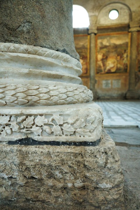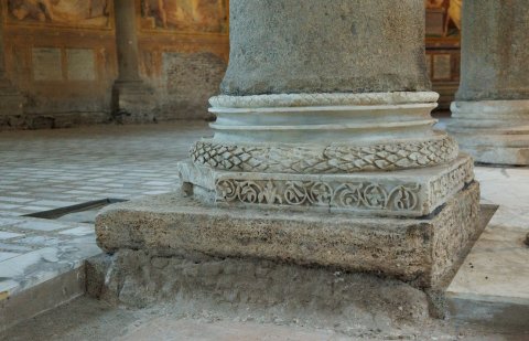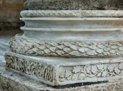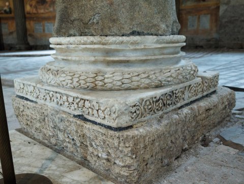 - Plinthe alternierend mit Spiralranken und Eichenblattranken auf den Seiten, darauf Basis mit Wulst mit Lorbeerstab unten und Blattstab oben, dazwischen tief unterschnittene Profilierung.