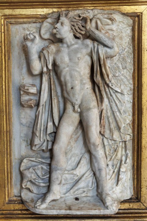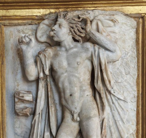 - Mythische Figur: jugendlicher geflügelter Windgott, nach links hin bewegt, in der rechten Hand Flöte.