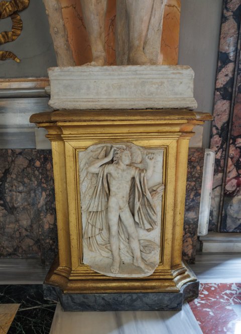 - rundum beschnitten, Beine, rechter Unterarm u. Teile des Mantels ergänzt, im 17./18. Jh. in eine Statuenbasis eingefügt