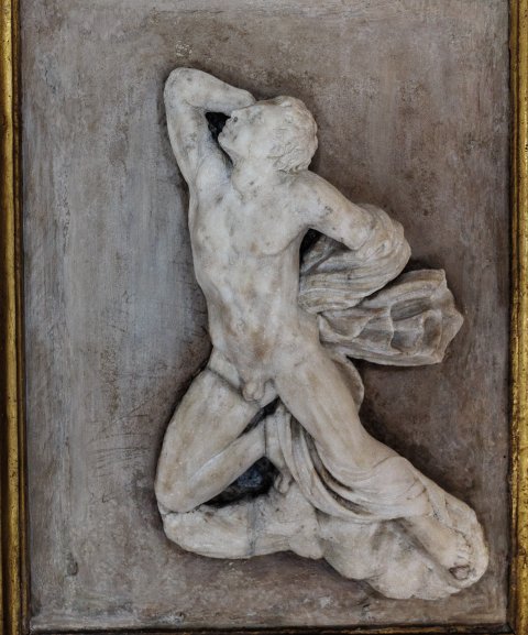 - Mythos: ins Knie gesunkener Niobide, beide Hände greifen zum Rücken