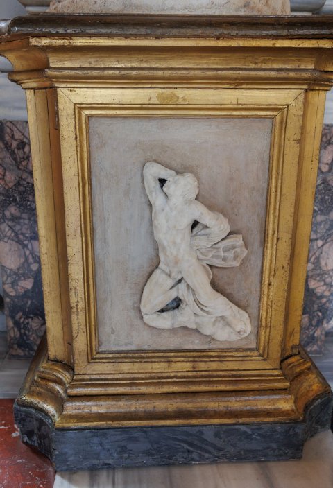 - rundum beschnitten, linkes Bein ergänzt ergänzt, im 17./18. Jh. in eine Statuenbasis eingefügt
