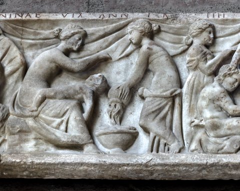Mythos. In der Mitte Bad des Dionysoskindes: zwei Nymphen, die linke mit dem Kind auf den Knien, die rechte giesst Wassern in ein rundes Becken.