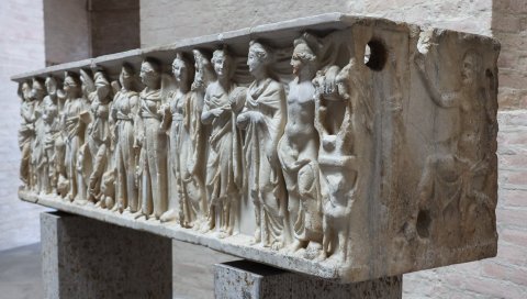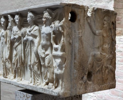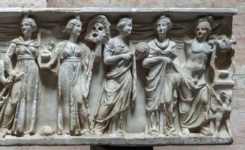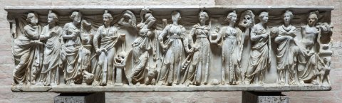 Auf den Schmalseiten je ein sitzender Dichter oder Philosoph mit Pfeiler vor sich, auf dem Schriftrolle (volumen) bzw. Rollenbündel steht.