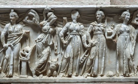 Mythische Figuren, Musikinstrument. Musen mit Attributen, zwischen ihnen Minerva mit Helm und Eule, am rechten Rand Apollo mit Kithara und Greif.