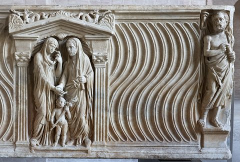 Riefelsarkophag . In der Mitte der Vorderseite Aedicula mit kannelierten Pfeilern und offenem Giebel mit Akroteren und in Muschelhörner blasende Tritone. Unter dem Giebel Muschelnische und stehendes Ehepaar, beide mit über den Kopf gezogenem Mantel, Togatus mit Schriftrolle (volumen). Vor ihnen Hymen mit Fackel.