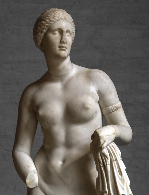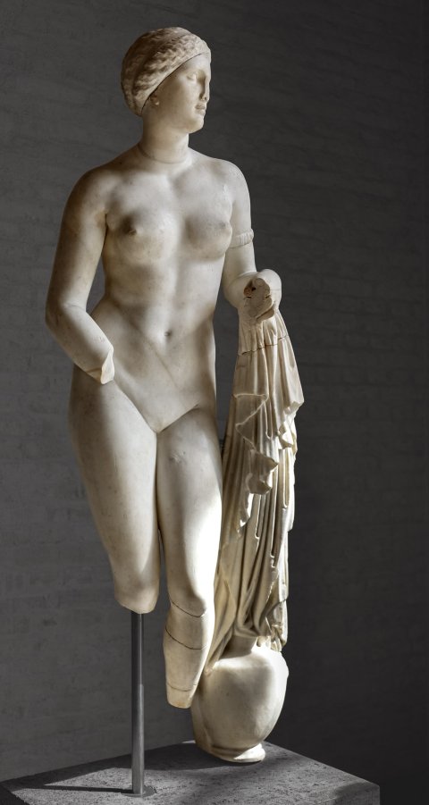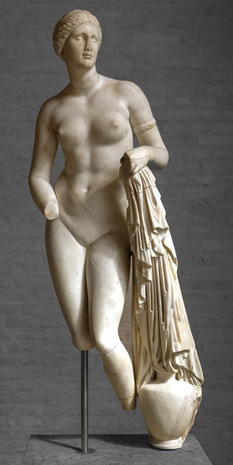 - mythische Figur: stehende nackte Venus, neben sich Gefäß ; römische Kopie der Aphrodite von Knidos des Praxiteles, um 330 v. Chr.