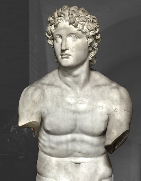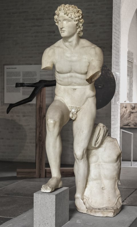- Historische Person: Alexander d. Gr., nackt, rechter Fuß hochgestellt, neben dem linken Bein Brustpanzer. Römische Kopie, Original um 330 v. Chr.