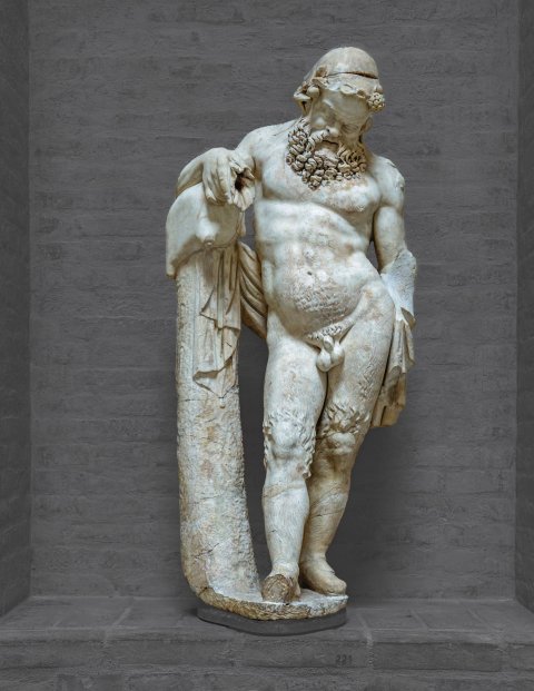 - mythische Figur: bärtiger nackter Silen mit Efeukranz, rechter Arm auf Weinschlauch gestützt, der auf einem Baumstamm liegt