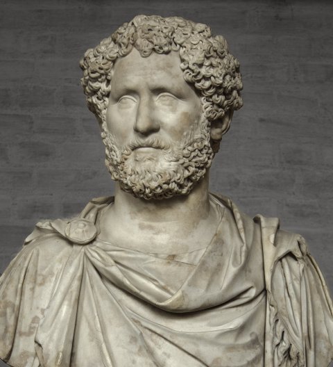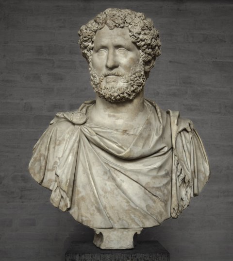 - Porträtbüste eines Mannes mit lockigem Haar und Bart, Mantel mit Scheibenfibel auf der rechten Schulter.