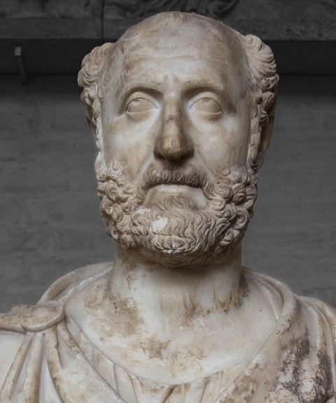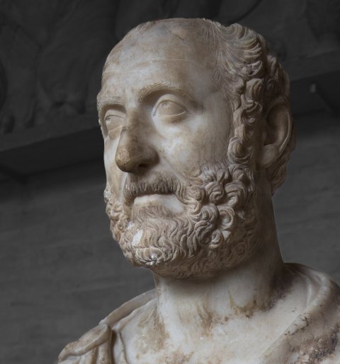 - Porträtbüste eines Mannes mit kahler Stirn und lockigem Vollbart, Mantel mit Fransensaum und Scheibenfibel auf der rechten Schulter.