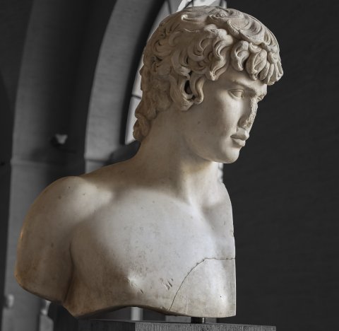 erhalten ist der Kopf mit Teil der rechten Bust mit Armansatz. Nase abgebr.
