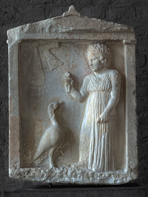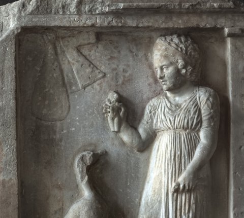 - Stehendes kleines Mädchen (Kind) im hoch gegürteten Chiton, Binde im Haar, in der erhobenen Rechten Puppe; vor ihm stehende Gans, darüber an der Wand hängende Geräte (Beutel und Werkzeug ?)