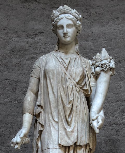 - Mythische Figur: stehende Tyche mit Ährenkranz und Füllhorn, Umbildung der Artemis des Praxiteles: Chiton mit Überschlag, Köcherband über der Brust, rechte Hand war zum Köcher erhoben.
