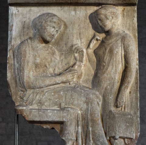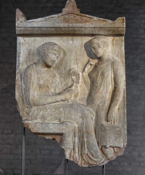 - Stele mit Giebel mit Akroteren. Im rahmenlosen Bildfeld nach rechts hin sitzende Frau in Chiton und Mantel, vor ihr stehende Dienerin mit Kästchen in der linken Hand