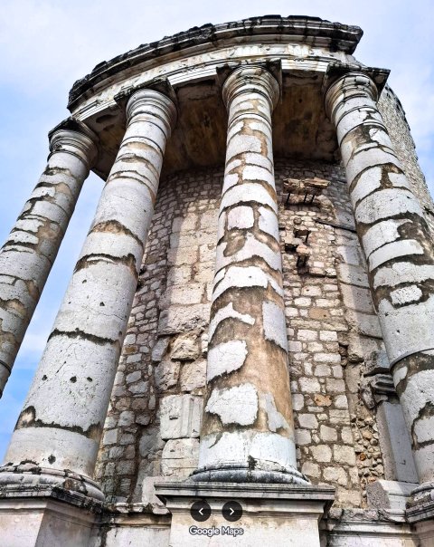 Über den Säulen Gebälk mit Metopenfries(lokaler Kalkstein).