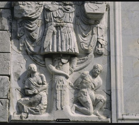 - Reliefs rechts und links der Inschrift: Tropaion mit an Baumstamm aufgehängten Waffen, unten kauern zwei mit Ketten gefesselte Gafangene (Mann und Frau).