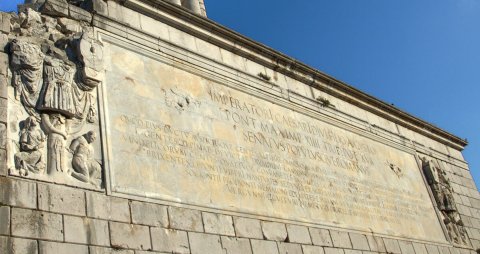 - Imperatori Caesari divi filio Augusto / pont(ifici) max(imo) imp(eratori) XIIII trib(unicia) pot(estate) XVII / senatus populusque Romanus / quod eius ductu auspiciisque gentes Alpinae omnes quae a mari supero ad inferum pertinebant sub imperium p(opuli) R(omani) sunt redactae / gentes Alpinae devictae Trumpilini Camunni Vennonetes Vennostes Isarci Breuni Genaunes Focunates / Vindelicorum gentes quattuor Cosuanetes Rucinates Licates Catenates Ambisontes Rugusci Suanetes Calucones / Brixentes Leponti Viberi Nantuates Seduni Veragri Salassi Acitavones Medulli Ucenni Caturiges Brigiani / Sogiontii Brodionti Nemaloni Edenates (V)esubiani Veamini Gallitae Triullatti Ectini / Vergunni Egui Turi Nemeturi Oratelli Nerusi Velauni Suetri