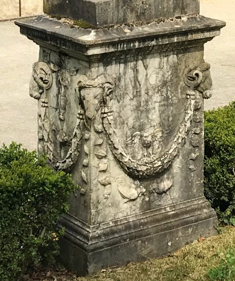 - an jeder senkrechten Kante ein Widderkopf, dazwischen je eine gespannte Girlande, auf Vorderseite mittig daraufsitzend ein Adler mit gespreizten Flügeln, darunter zwei Vögel, auf Rückseite mittig auf Girlande sitzender Adler mit gespreizten Flügeln, darunter einander anschauende Hähne, auf der rechten Seitenfläche Kanne, auf der linken Seitenfläche Bukranion.