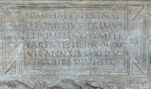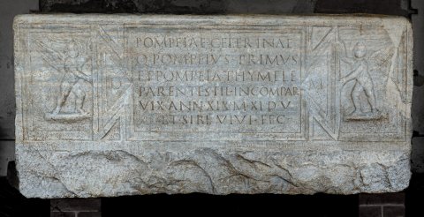 - D(is) M(anibus) // Pompeiae Celerinae / Q(uintus) Pompeius Primus / et Pompeia Thymele / parentes fil(iae) incompar(abili) / vix(it) ann(os) XIX m(enses) XI d(ies) V / et sibi vivi fec(erunt)