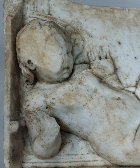 - Mythische Figur: auf den Rücken fallender nackter Erot, im Hintergrund Podest mit kannelierten Pilastern. Fragment eines Reliefs mit dem leeren Thron für Dionysos.